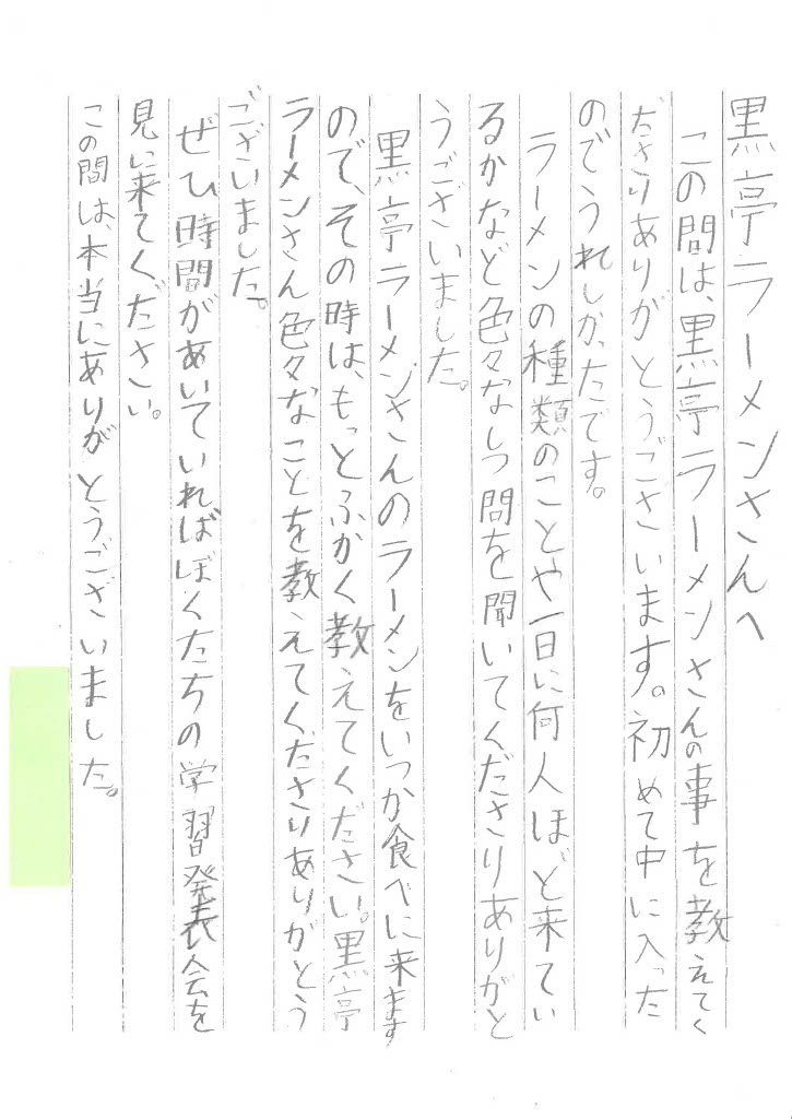 10月に古町小学校から、三年生の児童の皆さまが黒亭本店に見学に来てくださいました。